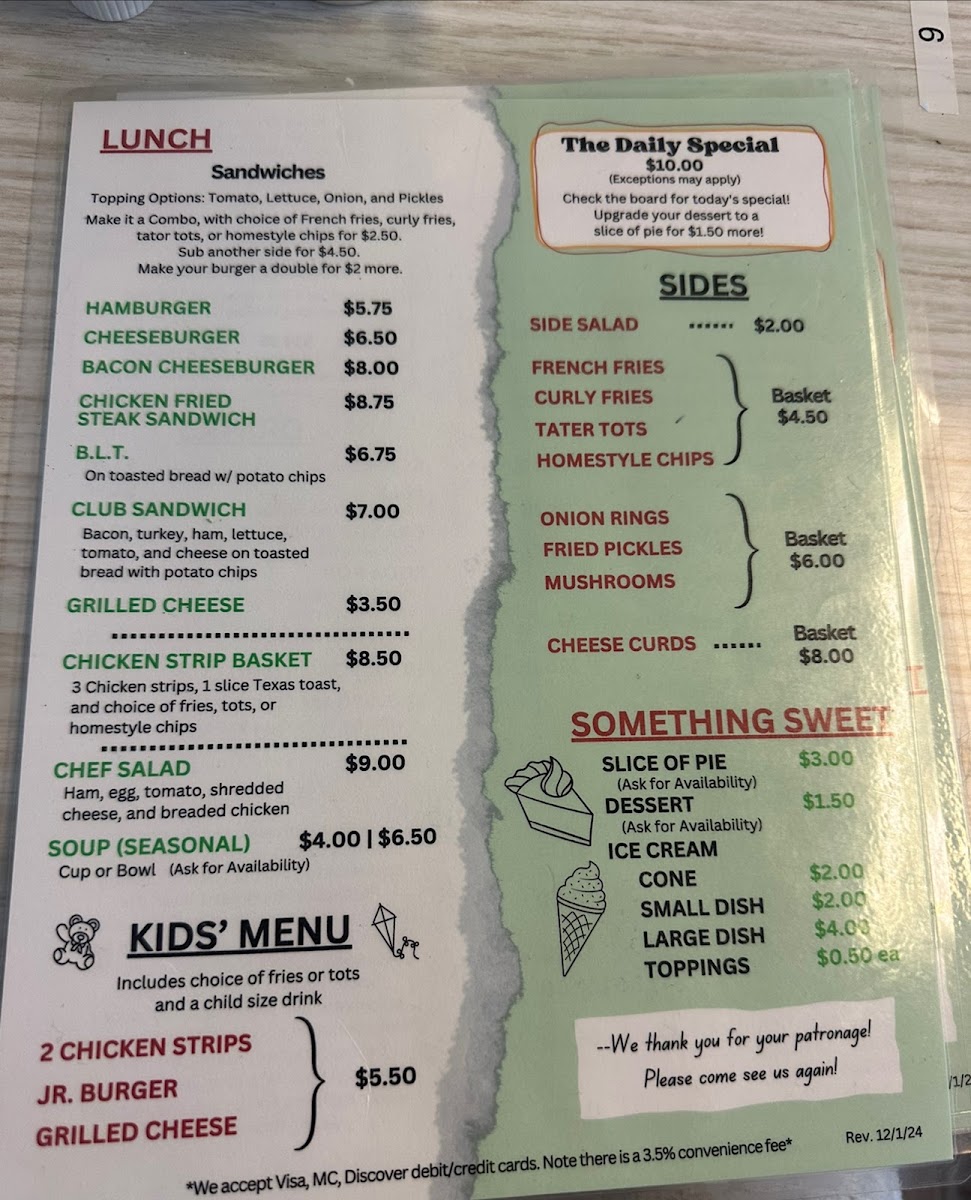 Welcome to Green Cafe, your charming haven for delicious, home-cooked meals nestled in the heart of Green, KS. Our menu offers a delightful range of options to satisfy breakfast cravings. Start your day with beloved favorites like the Rise 'N' Shine or our hearty B & G Platter - both designed to kickstart your mornings! For something sweet, don’t miss our delicious Slice of Pie or refreshing Ice Cream.